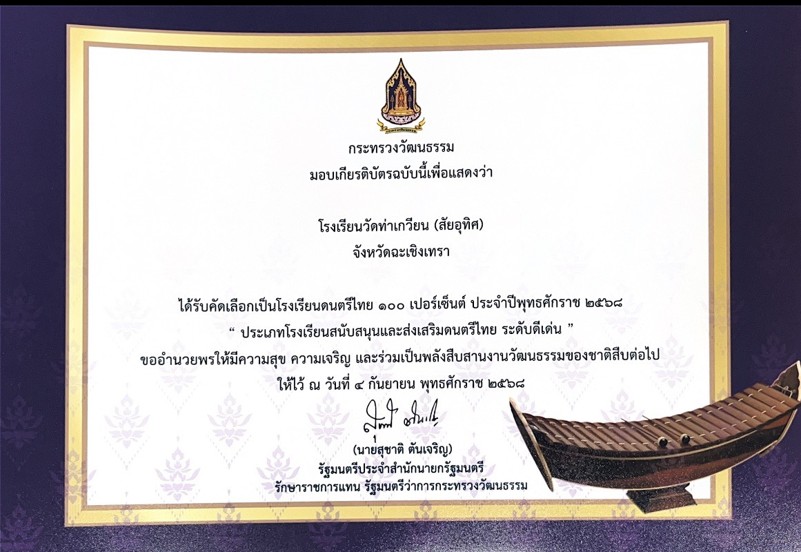 หน้าหลัก ข่าวประชาสัมพันธ์ กิจกรรม โรงเรียนดนตรีไทย 100 เปอร์เซ็นต์ ประจำปีพุทธศักราช 2568 "ประเภทโรงเรียนสนับสนุนและส่งเสริมดนตรีไทย ระดับดีเด่น" จากกระทรวงวัฒนธรรม 30 October 2025 กิจกรรม 473 ครั้ง วันที่ 27 ตุลาคม 2568 นายสมชาย มะลิซ้อน ผู้อำนวยการโรงเรียน มอบนางสาวศศมน ก่อเกียรติขจร รองผู้อำนวยการโรงเรียน พร้อมด้วย นางสาวพนิดา ทองสุข และนางสาวพรพรหม ประคองวงค์ศรี เข้ารับเกียรติบัตรที่ได้รับคัดเลือกเป็นโรงเรียนดนตรีไทย 100 เปอร์เซ็นต์ ประจำปีพุทธศักราช 2568 "ประเภทโรงเรียนสนับสนุนและส่งเสริมดนตรีไทย ระดับดีเด่น" จากกระทรวงวัฒนธรรม ลิงก์ที่เกี่ยวข้อง ไฟล์แนบ 573059849_1269562011640729_3743824270562703082_n.jpg 0 KB 574312463_1269562031640727_6439870829020419363_n.jpg 0 KB แชร์ข่าวสารนี้: Facebook Twitter LINE