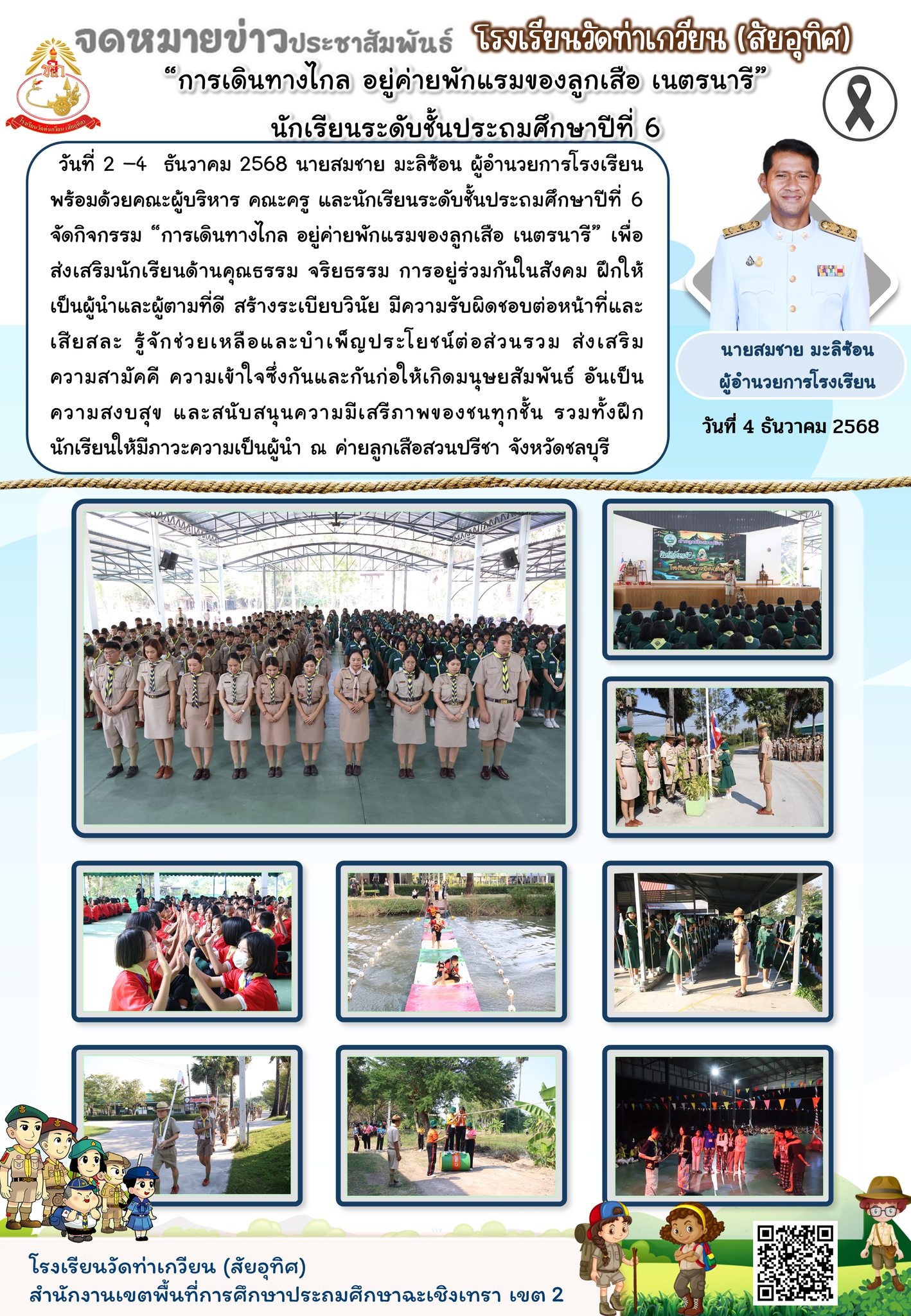หน้าหลัก ข่าวประชาสัมพันธ์ กิจกรรม จัดกิจกรรม “การเดินทางไกล อยู่ค่ายพักแรมของลูกเสือ เนตรนารี” 11 December 2025 กิจกรรม 108 ครั้ง วันที่ 2 – 4 ธันวาคม 2568 นายสมชาย มะลิซ้อน ผู้อำนวยการโรงเรียน พร้อมด้วยคณะผู้บริหาร คณะครู และนักเรียนระดับชั้นประถมศึกษาปีที่ 6 จัดกิจกรรม “การเดินทางไกล อยู่ค่ายพักแรมของลูกเสือ เนตรนารี” เพื่อส่งเสริมนักเรียนด้านคุณธรรม จริยธรรม การอยู่ร่วมกันในสังคม ฝึกให้เป็นผู้นำและผู้ตามที่ดี สร้างระเบียบวินัย มีความรับผิดชอบต่อหน้าที่และเสียสละ รู้จักช่วยเหลือและบำเพ็ญประโยชน์ต่อส่วนรวม ส่งเสริมความสามัคคี ความเข้าใจซึ่งกันและกันก่อให้เกิดมนุษยสัมพันธ์ อันเป็นความสงบสุข และสนับสนุนความมีเสรีภาพของชนทุกชั้น รวมทั้งฝึกนักเรียนให้มีภาวะความเป็นผู้นำ ณ ค่ายลูกเสือสวนปรีชา จังหวัดชลบุรี ลิงก์ที่เกี่ยวข้อง ไฟล์แนบ 591249052_1297742702155993_4229402573807584818_n (1).jpg 0 KB แชร์ข่าวสารนี้: Facebook Twitter LINE